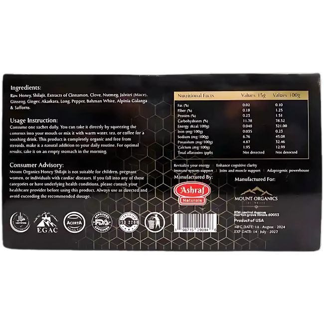 KING HONEY Shilajit Plus Mount Organics is your ultimate natural solution for improved energy, stamina, and performance. Whether you’re an athlete looking to enhance endurance, a busy professional needing a vitality boost, or simply looking for a natural way to stay energized throughout the day, this lab-tested supplement offers a potent and safe solution. With each sachet packed with a powerful blend of pure Shilajit and honey, you can trust KING HONEY to deliver consistent and effective results. Experience better energy, improved recovery, and enhanced stamina with KING HONEY Shilajit Plus.