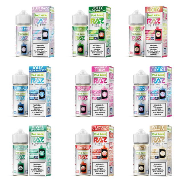 Upgrade your vaping experience with the RAZ Pod Juice E-Liquid 100ml Bottle—a game-changing solution for vapers seeking bold flavor, smooth nicotine delivery, and reliable performance. Designed to satisfy both freebase and salt nic enthusiasts, this premium e-liquid elevates every puff with consistent taste and cloud production.