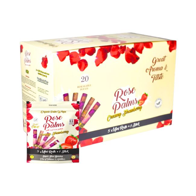 Indulge in the luxurious experience of ROSE PALM 5 Mini Rolls + 1 Stick. Each box contains 20 pouches, each with a delightful assortment of flavors to tantalize your taste buds. Choose from the classic Original flavor or explore the delicious options of Creamy Strawberry, Red Velvet, and Gummy Bear. With its convenient packaging and premium quality, ROSE PALM offers a sophisticated and satisfying smoking experience that you can enjoy anywhere, anytime.
