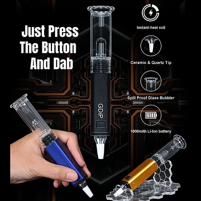 SMOQ GDIP DIPPER DAB PEN NECTAR COLLECTOR SMOQ GDIP Dipper Dab Vaporizer Pen Technical specifications: 5 clicks to start on/off system Li-Ion battery 16450/1000mAh Battery level indicator lights Miniaturized glass bubbler Overheat/short-circuit protection Instant-heat coil Ceramic Vapor Tip Quartz Vapor Tip Compact Design & Durable.