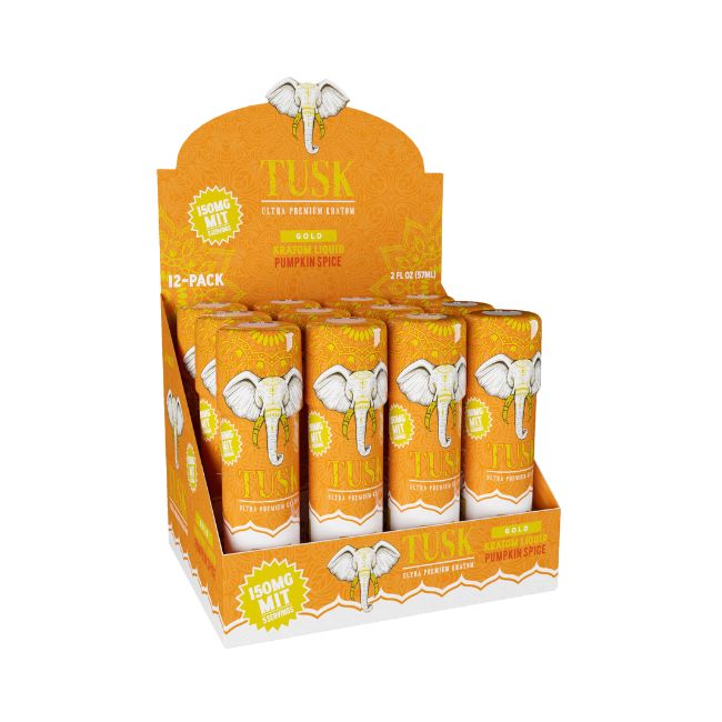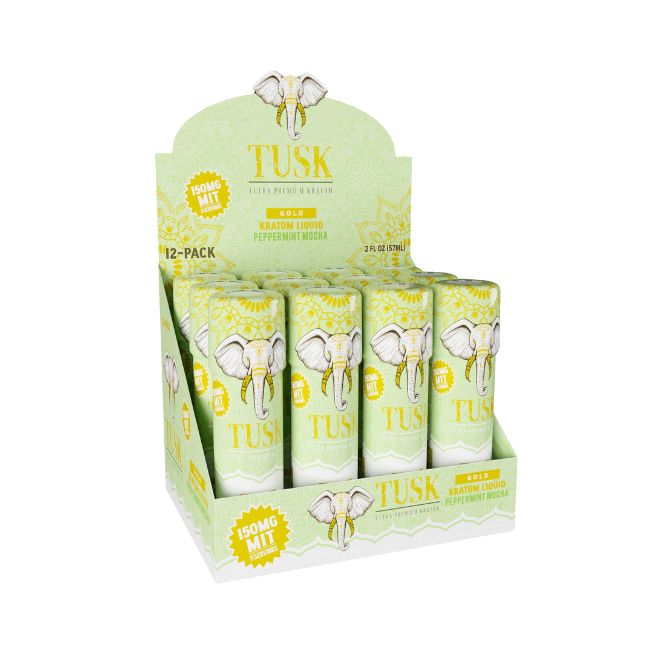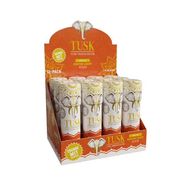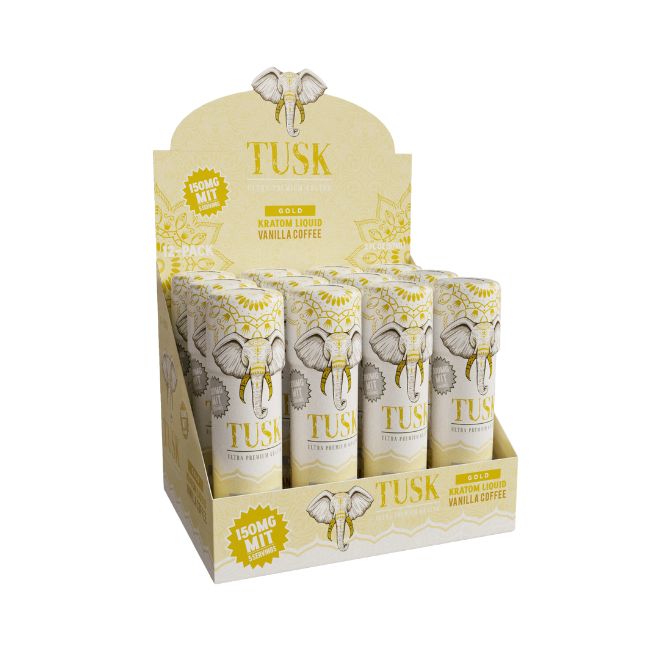 Tusk Ultra Premium Gold Kratom Liquid 150mg Mit Shot 2fl.oz (57ml) 12ct/ Box offers a variety of flavors, providing a convenient and enjoyable option for kratom enthusiasts looking for a potent and flavorful kratom shot experience.